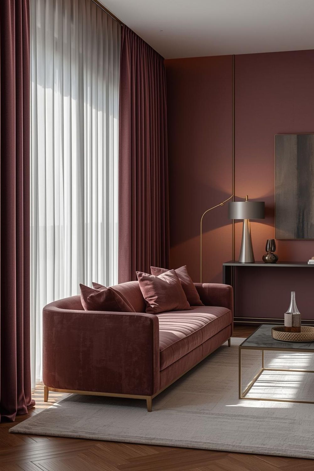 Curtains are one of the best “bang for your buck” upgrades because they change the scale of the whole room. Plum adds drama, taupe keeps it grounded, and brushed gold warms the finish. Ideal for any budget furniture: hang panels high to create height, improve privacy, and soften echo. A narrow console adds storage without blocking light.