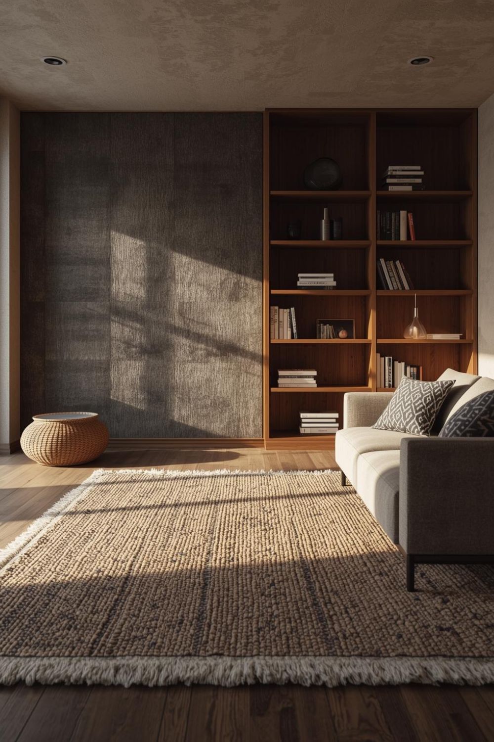 Cozy Living Room with Layered Rugs and Low Bookcase Wall
