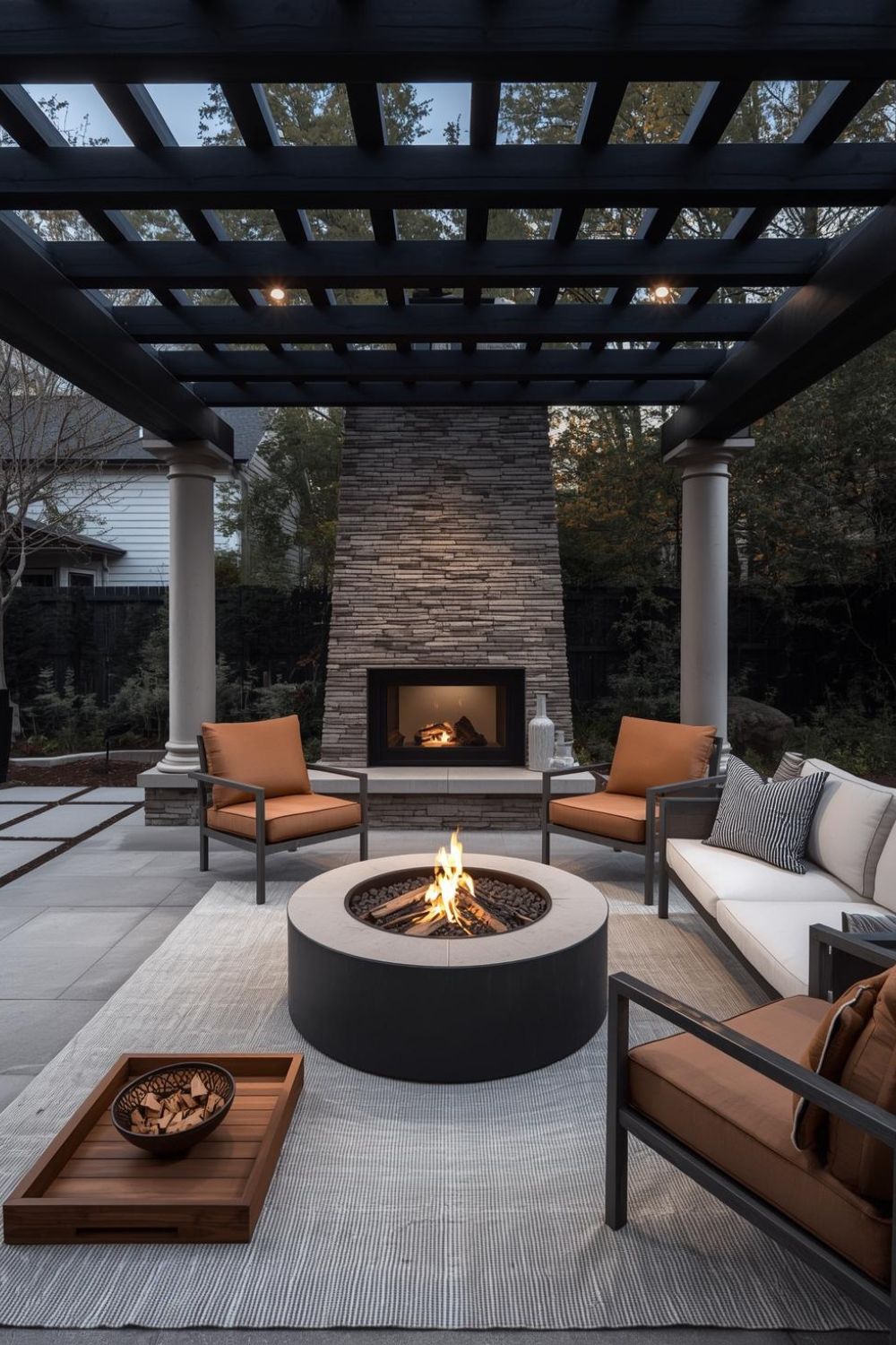 Contemporary Pergola Fire Pit With Black Beams and Warm Seating