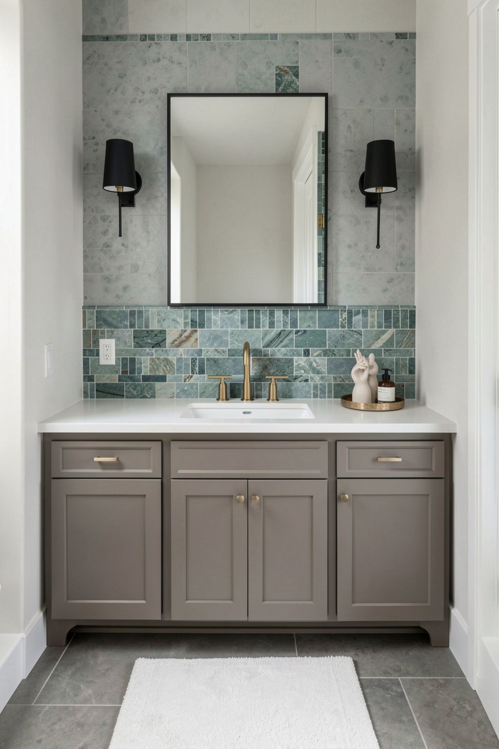 This blue-green mosaic reads detailed up close but stays calm from a distance, which is perfect for everyday living. A gold bridge faucet adds a classic note without making the room feel formal. It suits homeowners who want a “finished” look on a realistic budget plus you’ll appreciate the easy wipe backsplash behind daily splashes.