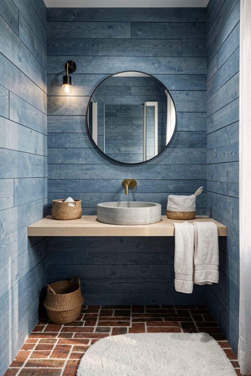 Denim shiplap adds warmth and subtle lines, giving you a rustic-modern blend that still feels current. A concrete vessel sink brings a grounded, tactile look, while the gold wall faucet keeps the counter easier to wipe down. Great for family bathrooms: the basket corrals extras, and the oak counter adds durability without fuss.