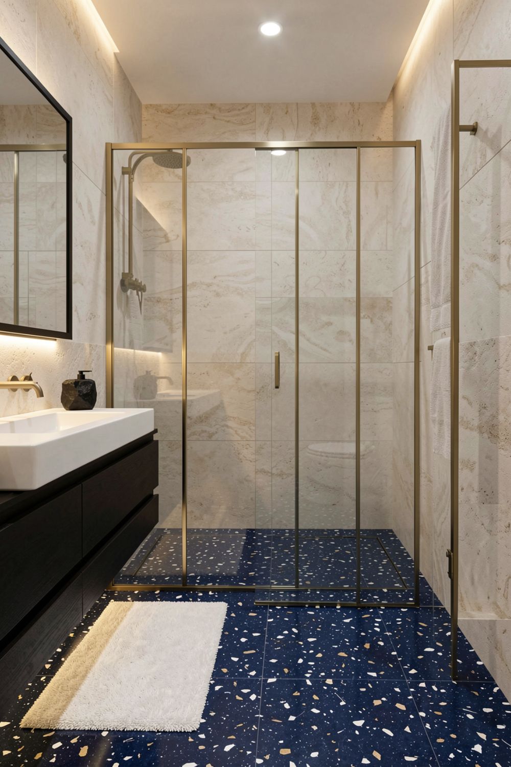 Midnight Blue Terrazzo Floor With Brass Frame Shower