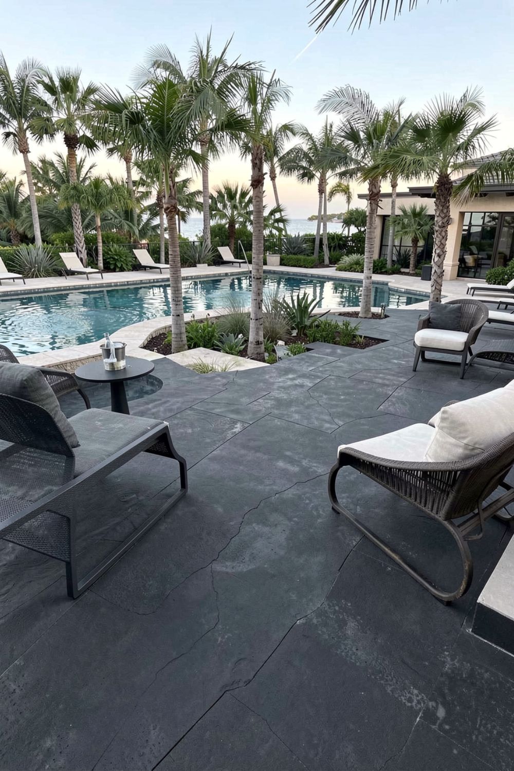 Charcoal concrete feels tailored and modern, and it’s forgiving with footprints and pool traffic. A consistent rhythm of palms keeps the deck looking planned instead of scattered. Great for people who love an upscale resort mood and don’t want fussy décor. Add a side table to prevent wet items from landing on the deck, and keep an ice bucket nearby for easy hosting without extra trips inside.