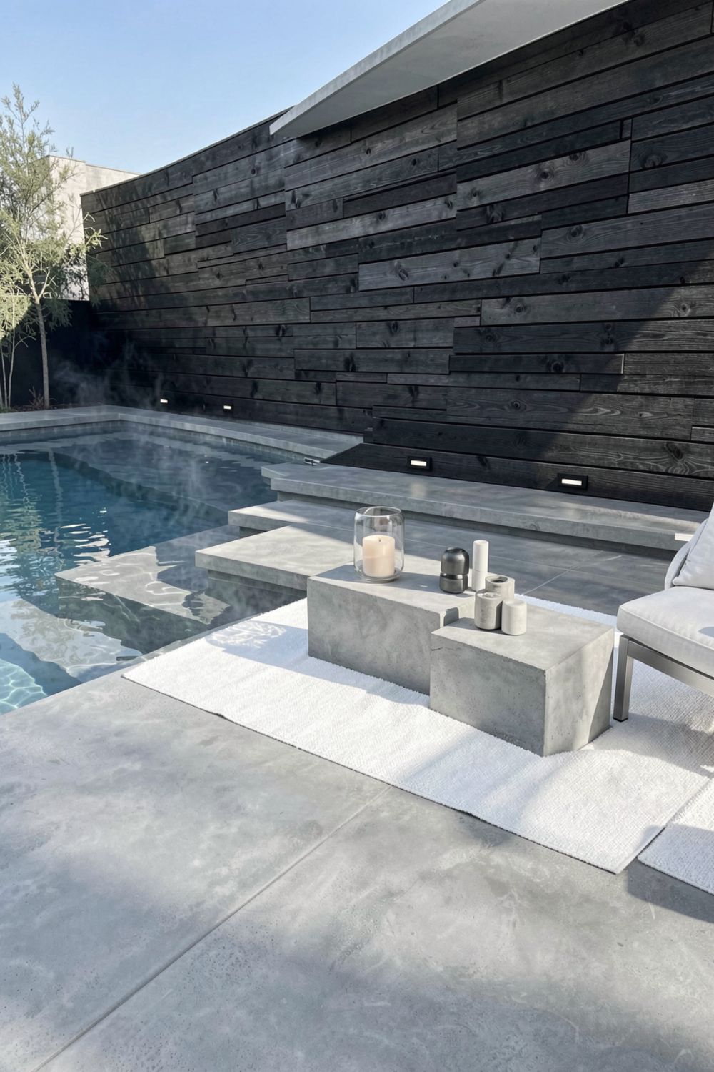 Two-tone concrete is a simple way to make a basic deck look layered and custom. The warm border visually frames the pool while the cool field keeps the space modern. This suits homeowners who want a spa corner that feels tucked in and comfortable. A cedar privacy screen blocks views without blocking breezes. Keep towels rolled on a teak stool so the deck stays clear and the spa steps remain safer for wet feet.