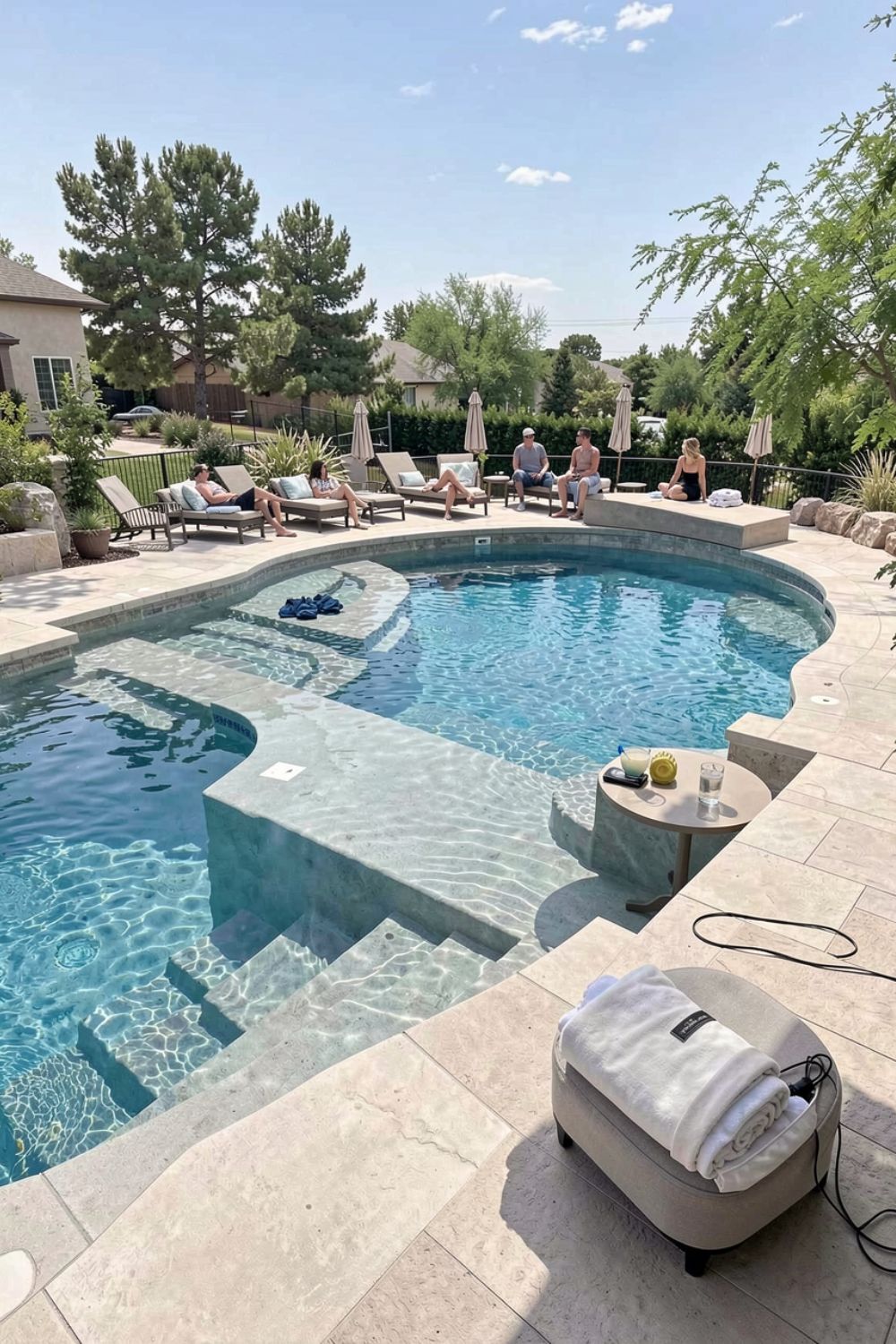 A curved island changes how the deck is used people naturally gather there, and it makes the pool area feel like a destination instead of a pass-through. Reinforced concrete supports the clean curves and keeps edges crisp. This is perfect for design-forward homeowners who want sculptural shapes with real comfort. Add a round side table for drinks and sunscreen, and keep a lidded ottoman nearby to store rolled towels and speaker cords.