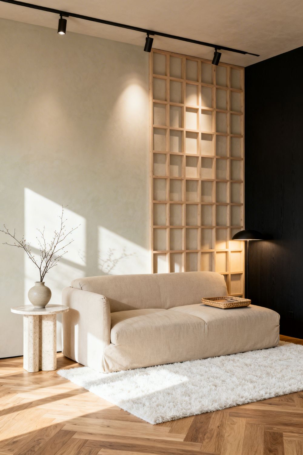 Japandi Luxury Mix With Oak Grid Wall and Linen