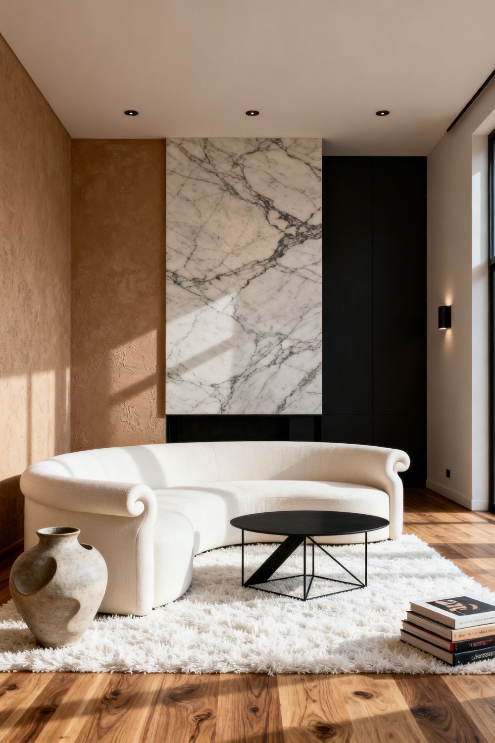 This room leans into quiet luxury with soft neutrals, a bold marble focal wall, and crisp black accents that keep it contemporary. The curved sofa shape adds a gallery-like feel while staying approachable. It suits anyone who hosts often, because the layout keeps conversation centered and pathways clear, while the coffee table and concealed side storage keep clutter out of sight.