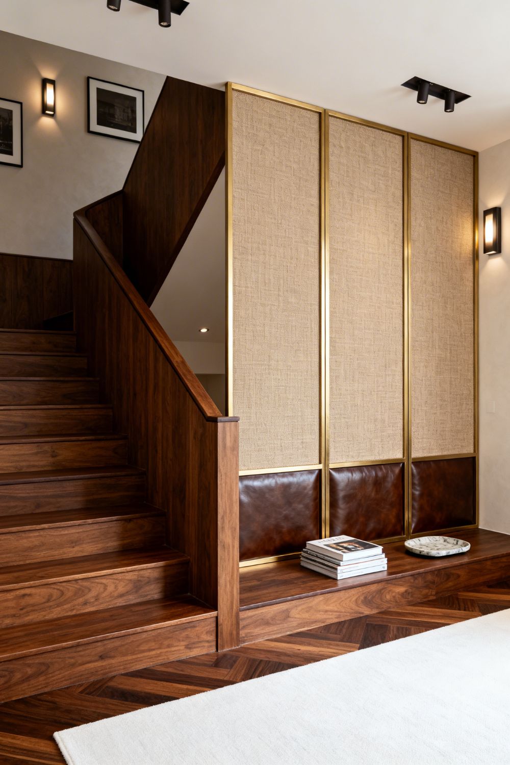 Fabric panels are an unexpected luxury move: they look tailored and quietly improve acoustics. Brass framing keeps it crisp, while walnut adds warmth and weight. Dark wall grazers make the weave read expensive, not flat. Perfect for echo-prone entry halls or duplexes: the screen softens sound, creates a calm transition space, and the stair stays practical with enclosed risers and comfortable footing.