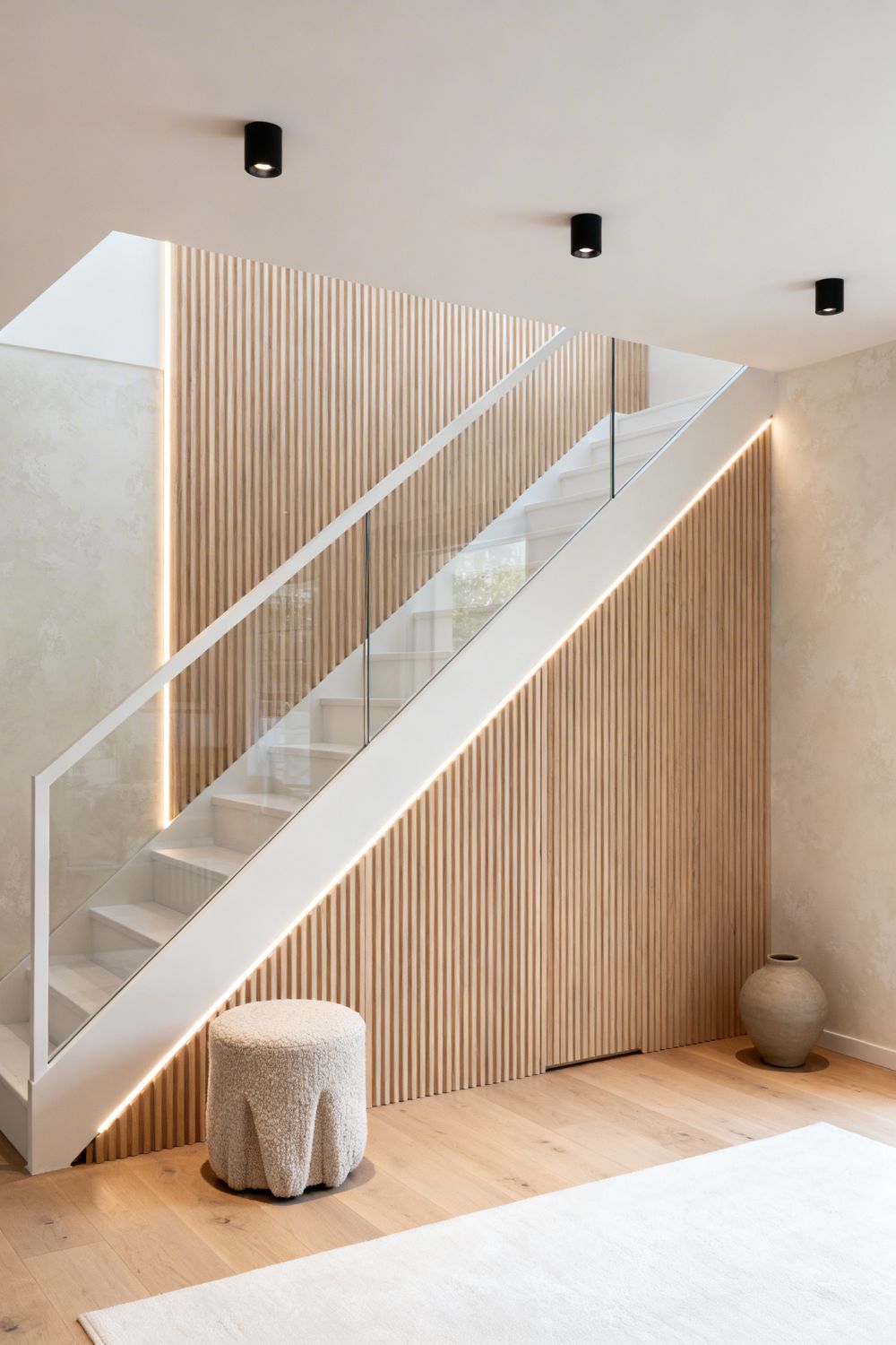 Fluting adds quiet luxury subtle, tactile, and elegant in daylight and even better under low, dark lighting. The clean white stringer keeps the architecture crisp, letting the wood detail lead. Great for smaller homes that still want impact: the panel visually lengthens the wall, helps hide stair structure, and the runner softens footsteps while keeping the look airy and bright.