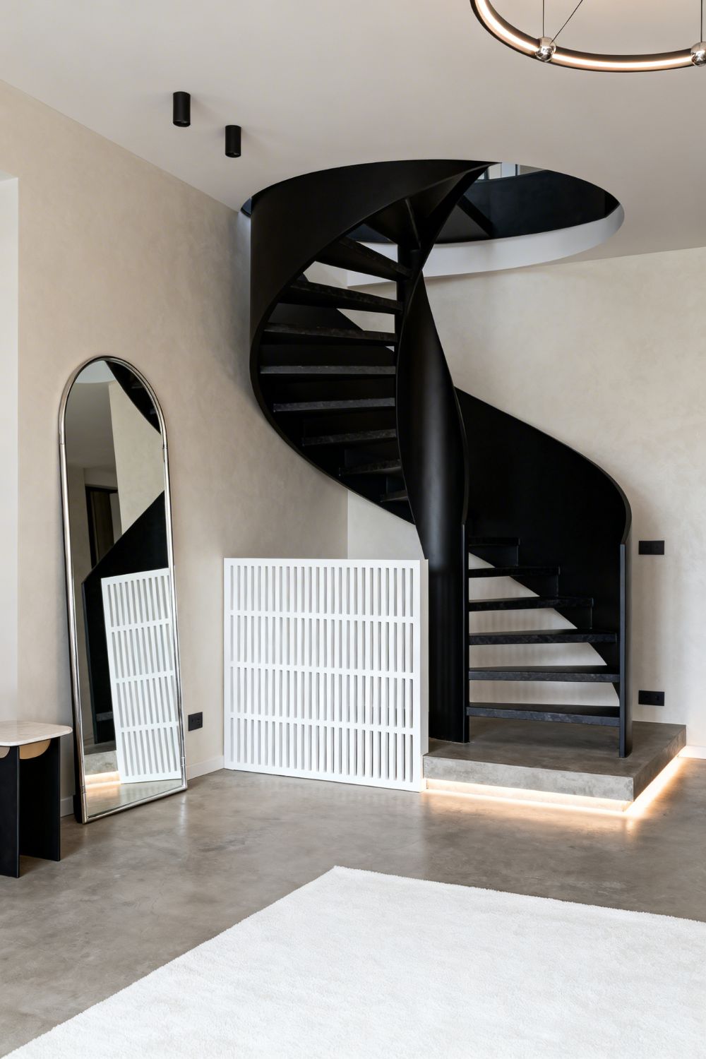 A spiral stair can feel sculptural, and the micro-slatted panel keeps it from looking exposed or chaotic. The black-and-white contrast reads sharp and editorial, especially under dim, modern lighting. Ideal for tight footprints and mezzanines: the partition subtly guides traffic, the mirror expands the look of the entry, and the runner helps prevent slips where you turn into the stair.