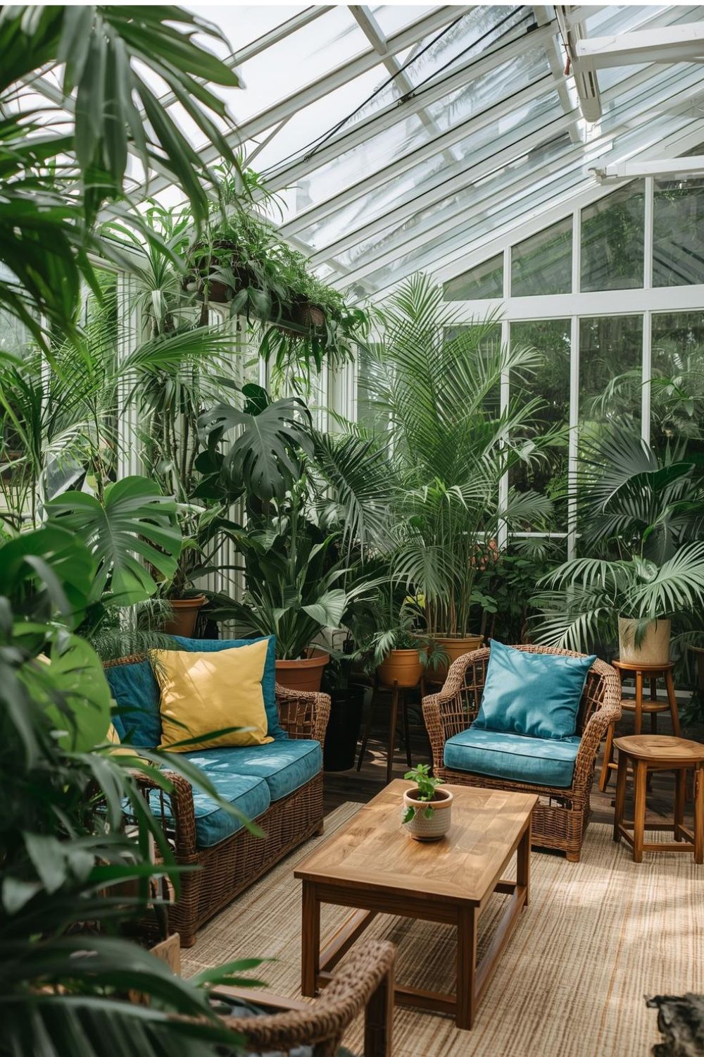 This version of greenhouse decor feels a little more elevated while staying comfortable. The wicker sofa keeps things casual, but the neat plant styling and curated accessories bring a pulled-together finish. Teal and yellow accents add warmth and personality under natural sunlight. It suits anyone who wants a bright, elegant space that works for real daily life.