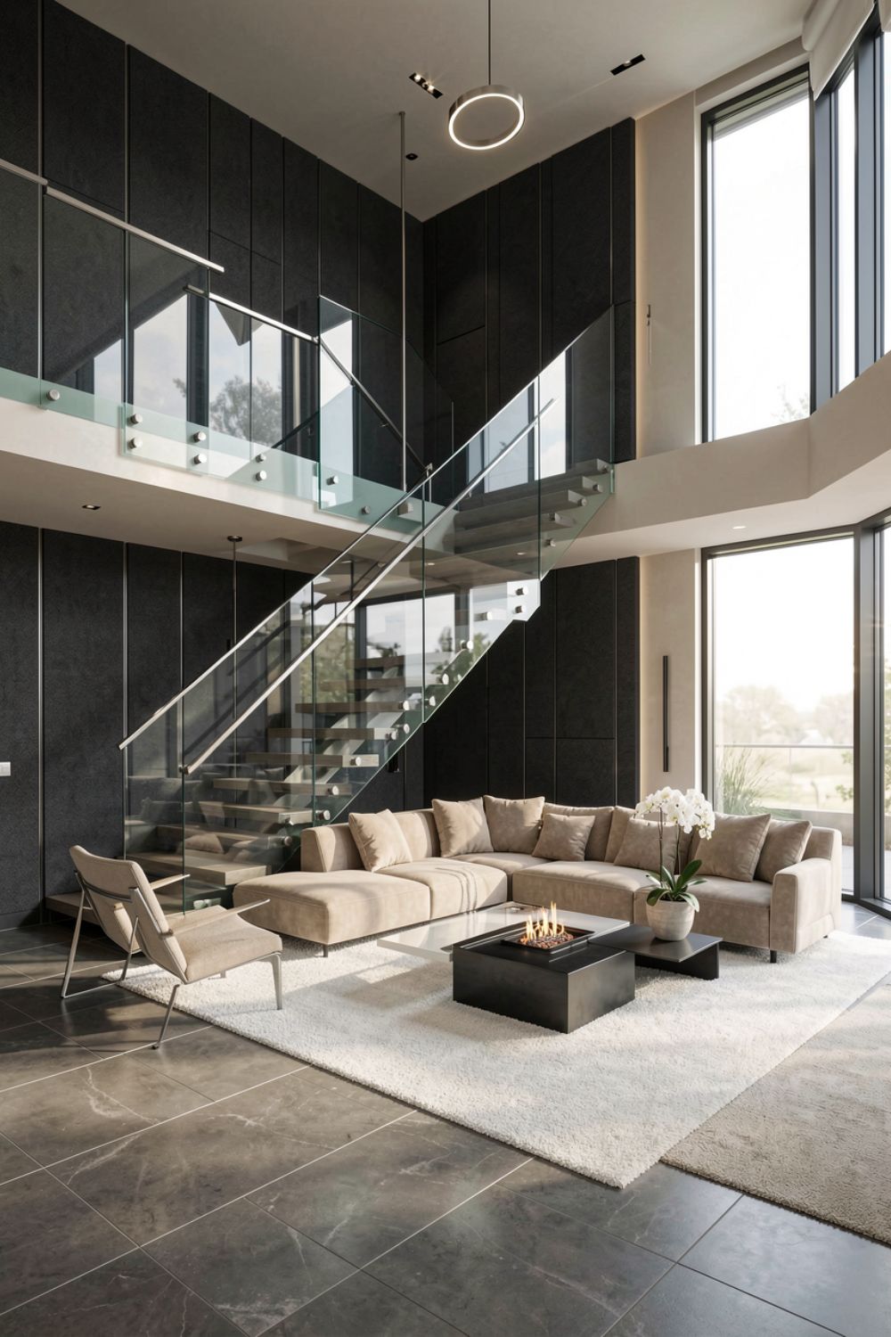 The glass box staircase keeps the vertical space feeling open while the charcoal panels add a quiet, tailored backdrop. A firetable brings warmth without a bulky hearth excellent for modern condos and newer builds. This plan favors clean circulation, with seating that faces inward for conversation and outward for views, all softened by the white rug underfoot.