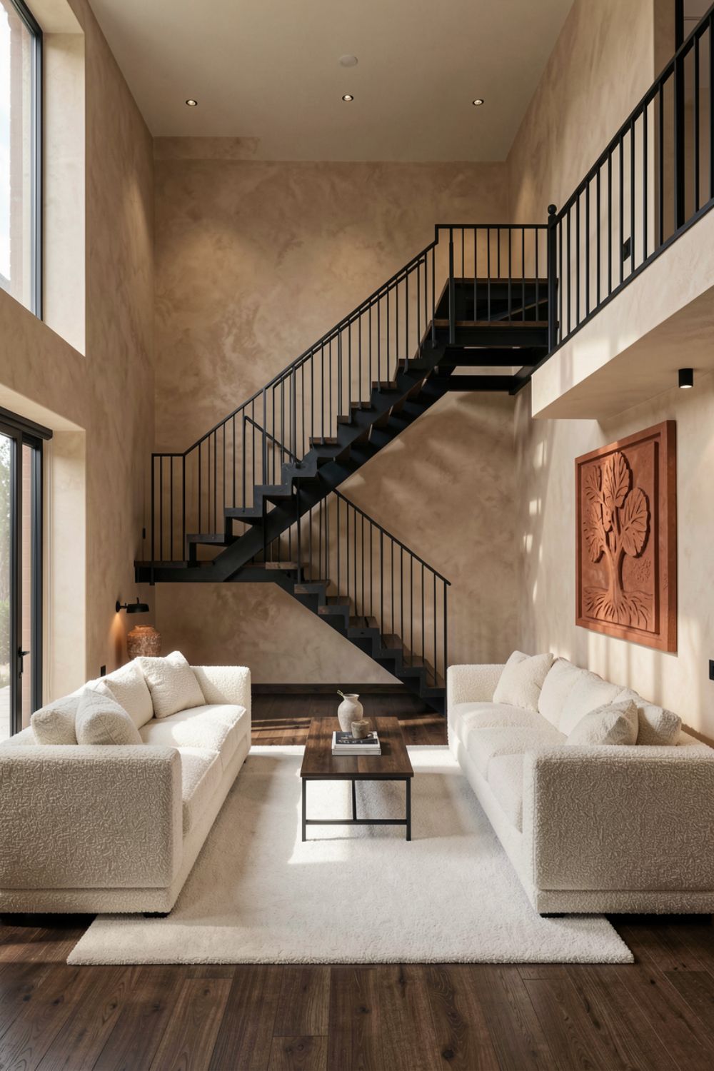 A split-level stair adds architectural rhythm and makes the double height room feel intentionally planned. Bouclé sofas bring texture and comfort, perfect for long chats or movie nights. Terracotta art warms the tall wall without adding visual clutter. This setup suits social households because the face-to-face sofas encourage conversation and keep traffic paths clear.