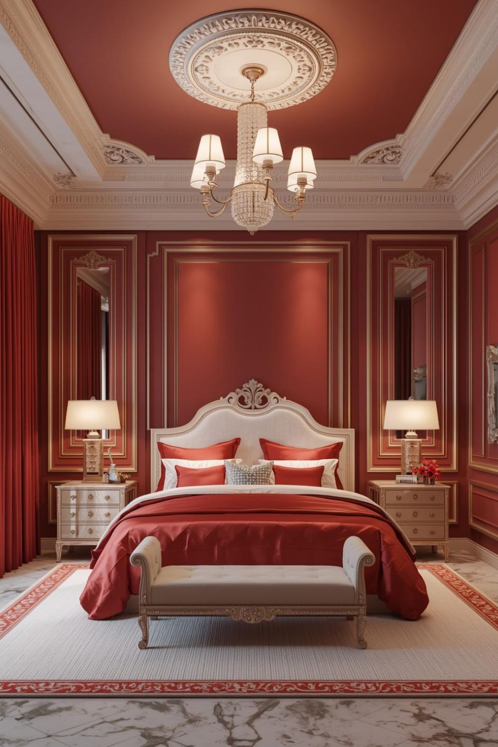 Crimson drapery delivers dramatic framing, while pearl wall panels and a satin-upholstered bed keep the room bright and polished. The carved headboard adds classic form, yet the clean side tables maintain a modern outline. A gilded mirror amplifies chandelier sparkle in low light, and white carpet over patterned marble softens the intensity into a refined, royal finish.