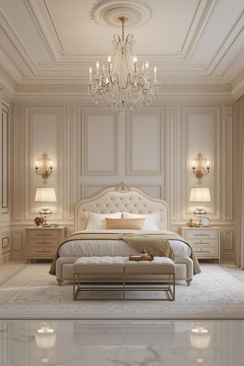 Ivory walls and panels make the ornate ceiling feel even more sculptural, while champagne drapes bring warmth without heaviness. The carved headboard reads classic, yet the clean-lined side tables keep the layout modern. Because the white carpet sits over pale marble, the room looks bright even with dim, evening-style lighting.