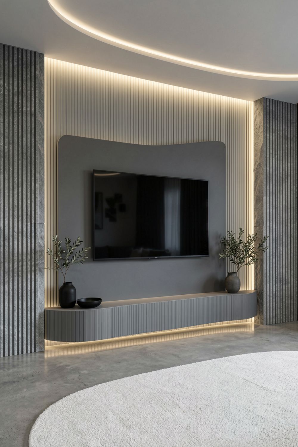 This design leans architectural: graphite reads sleek and quiet, while the fluted stone introduces rhythm and shadow. The curved LED glow keeps the central panel from feeling heavy. It suits modernists who appreciate structure and clean lines. Practical perks: the side columns can hide wiring chases, and a base cabinet can hold consoles and speakers. The white carpet adds softness for barefoot comfort.
