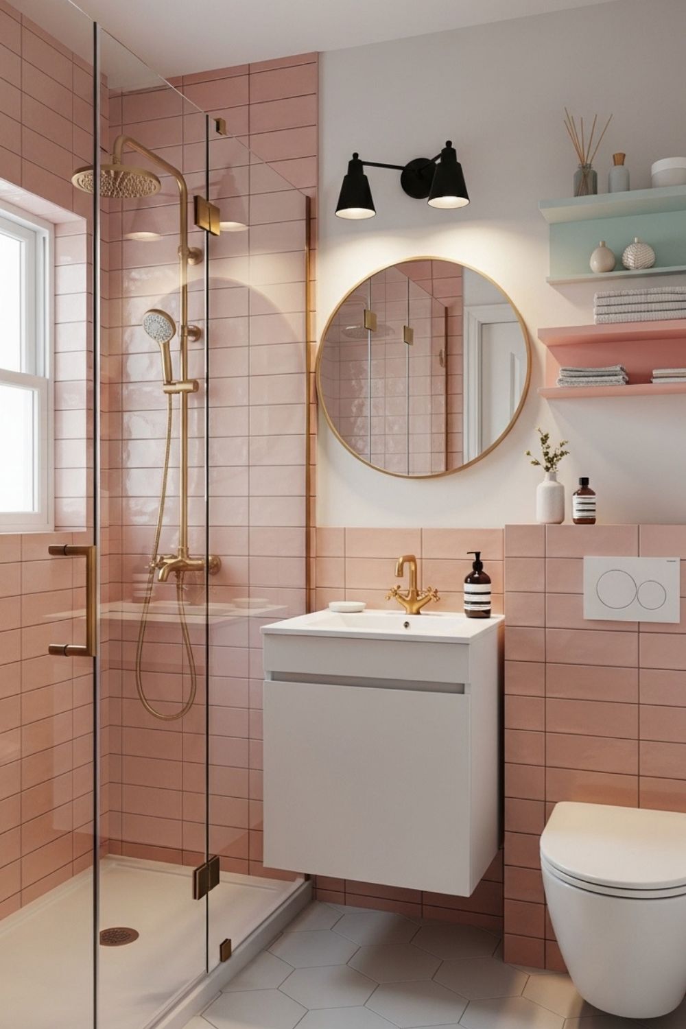 Here, the floating shelves become the main decor moment, kept airy and pastel so they don’t compete with the blush tile. Brass fixtures provide continuity between the shower and vanity, while black sconces anchor the wall with graphic contrast. The frameless enclosure preserves sightlines, and the hexagon floor adds subtle geometry without introducing additional colors.