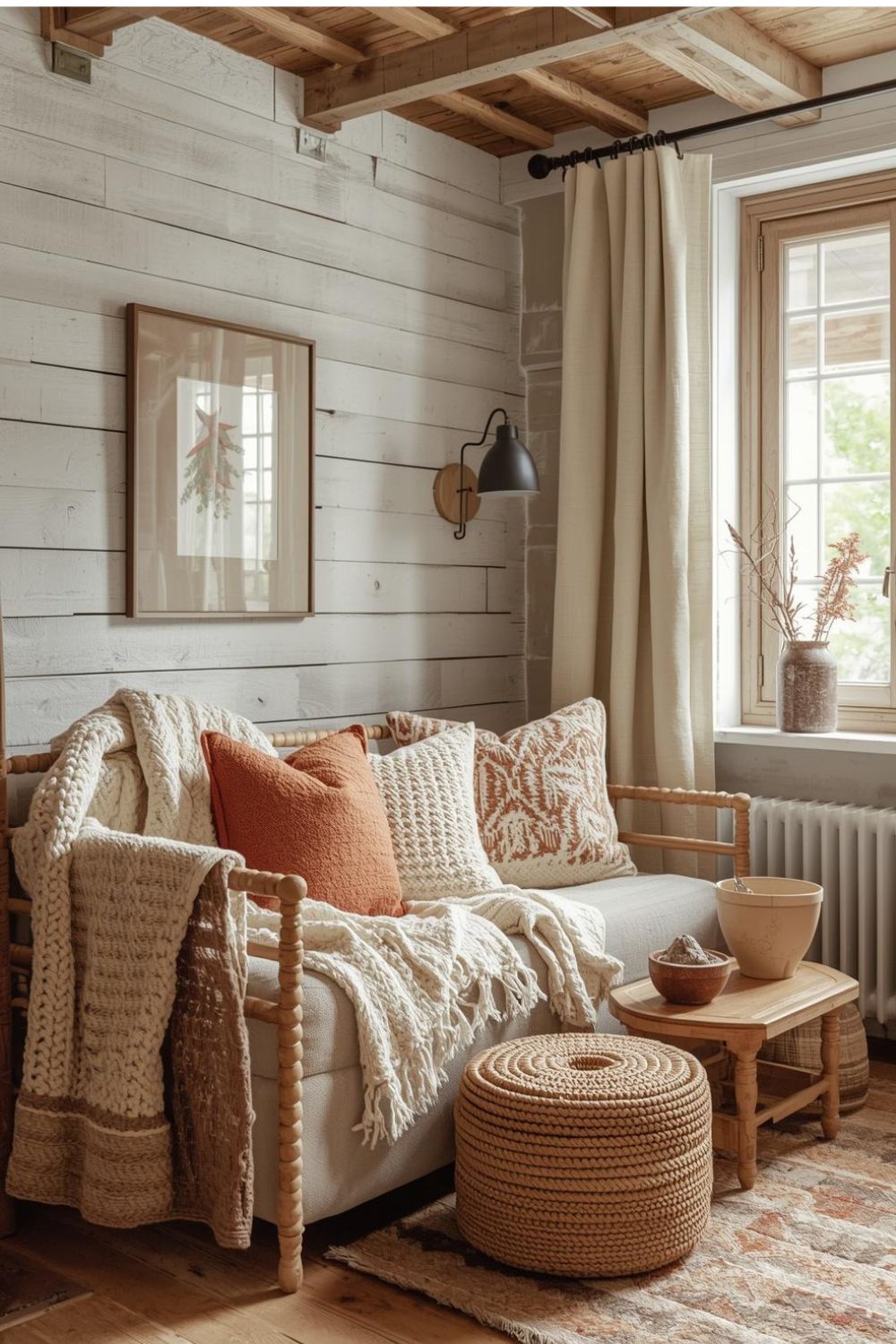 Rustic Cosy Reading Corner with Warm Wood and Textures