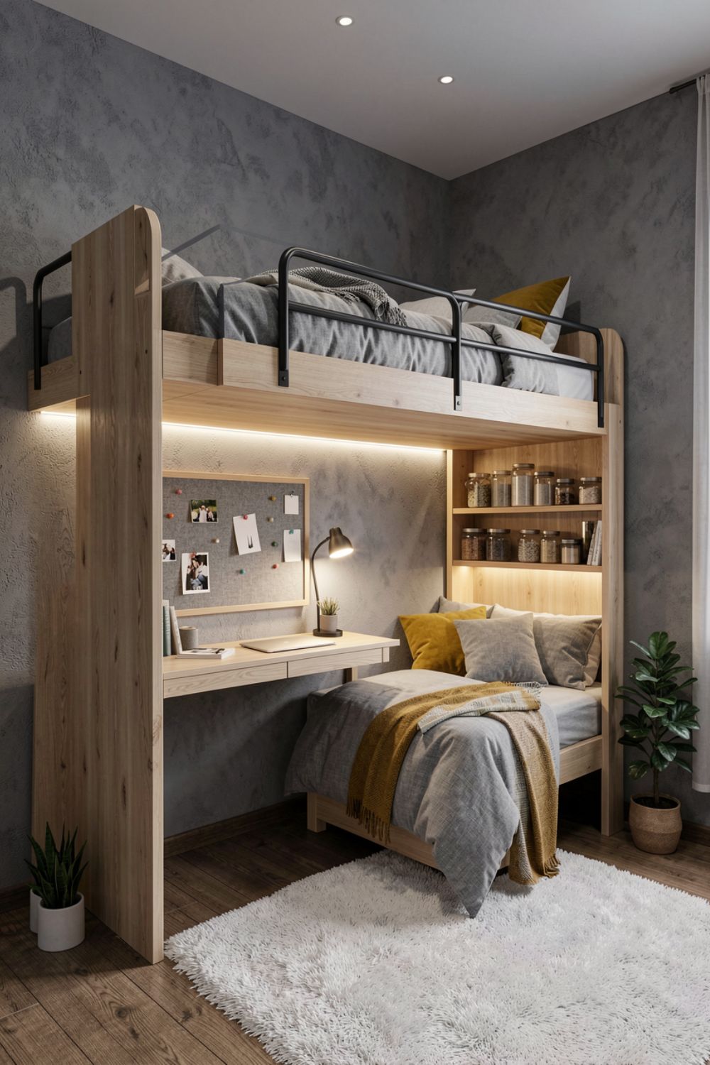 A bed alcove makes the sleeping area feel protected, while a wraparound desk offers serious work space without needing a larger room. Cork panels add warmth, pin-up function, and a quieter feel. This design is ideal for creative students or anyone juggling projects. Use the corner for a monitor, keep books along the side, and add a small drawer unit for supplies.