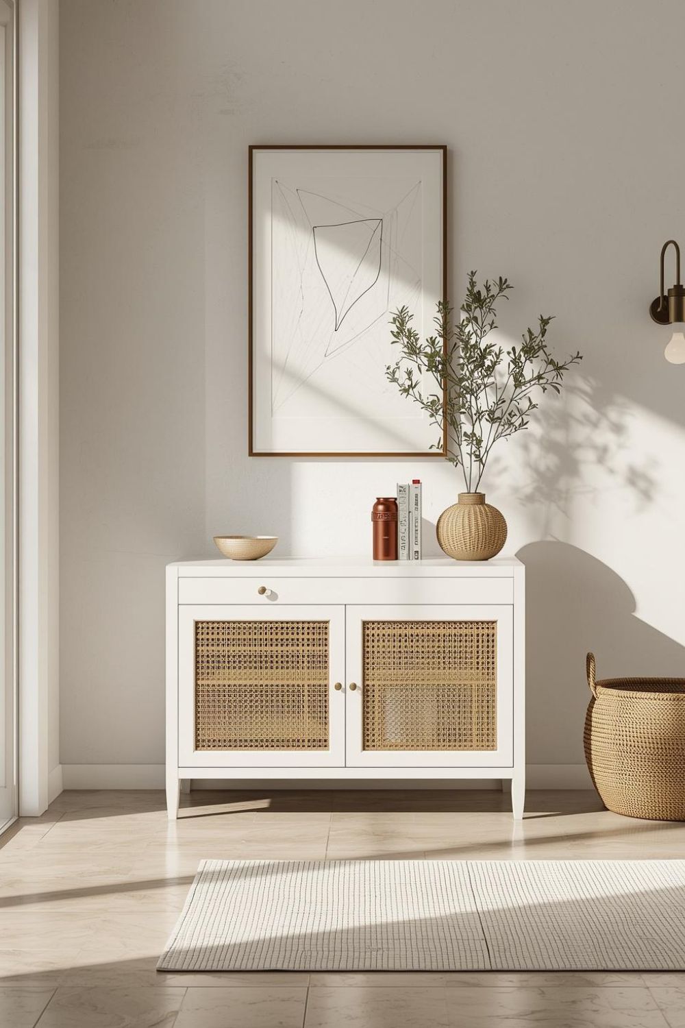 This cane-front credenza feels light, relaxed, and polished, perfect if you want storage without a heavy look. Brass hardware adds a subtle upgrade while cane helps with airflow. It suits coastal, modern boho, and bright minimal homes. Use the hidden drawer for mail and sunglasses, store shoes on adjustable shelves, and park a basket beside it for umbrellas.