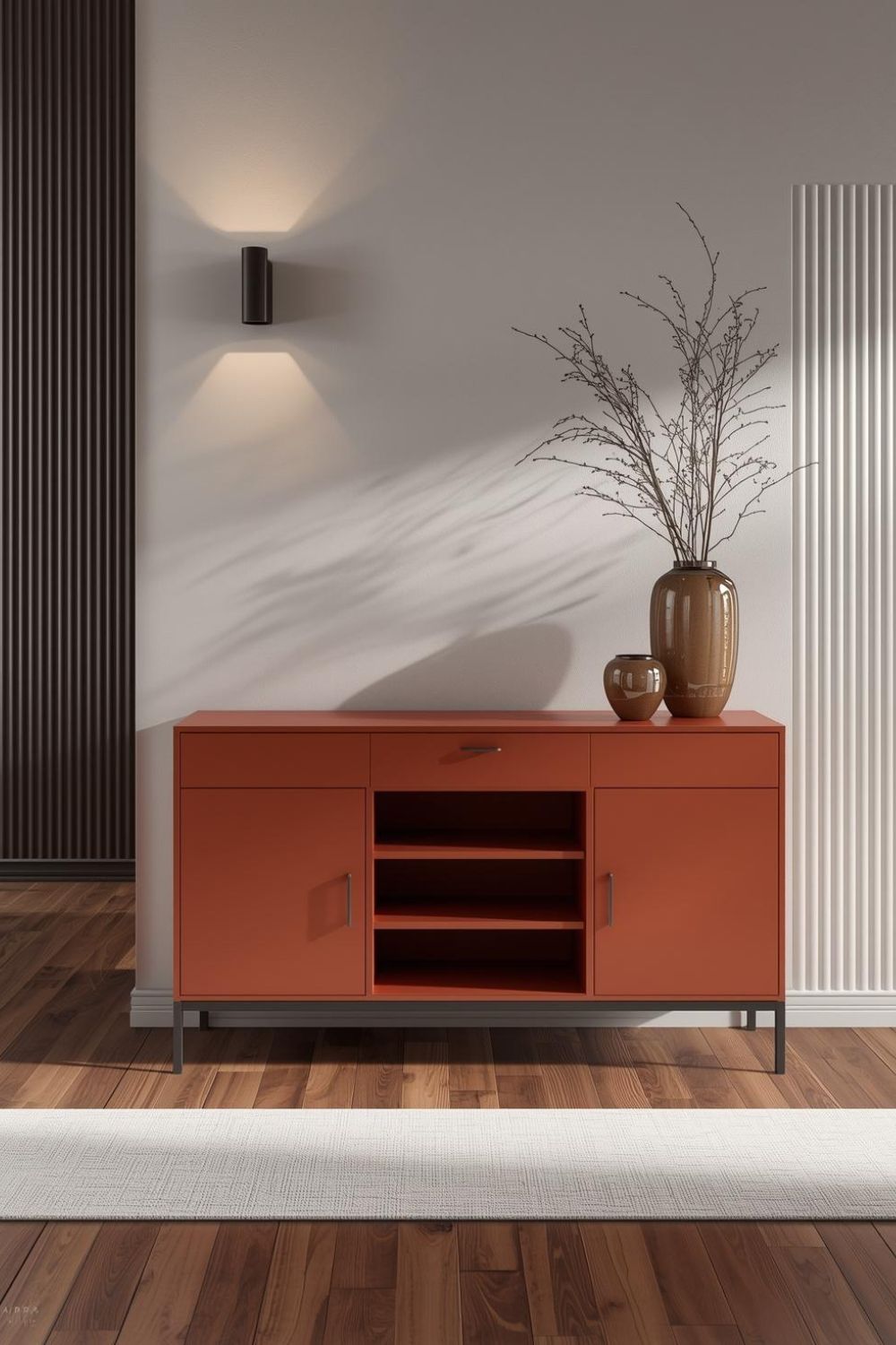 Terracotta adds personality in a sophisticated way, especially with flat fronts that keep the shape modern. Bronze hardware reads warm and slightly vintage without looking dated. This is a great choice if your entry needs color but still must feel tidy. Use the concealed drawers for keys, mail, and chargers, and keep shoes behind doors so the hallway looks instantly calmer from every angle.