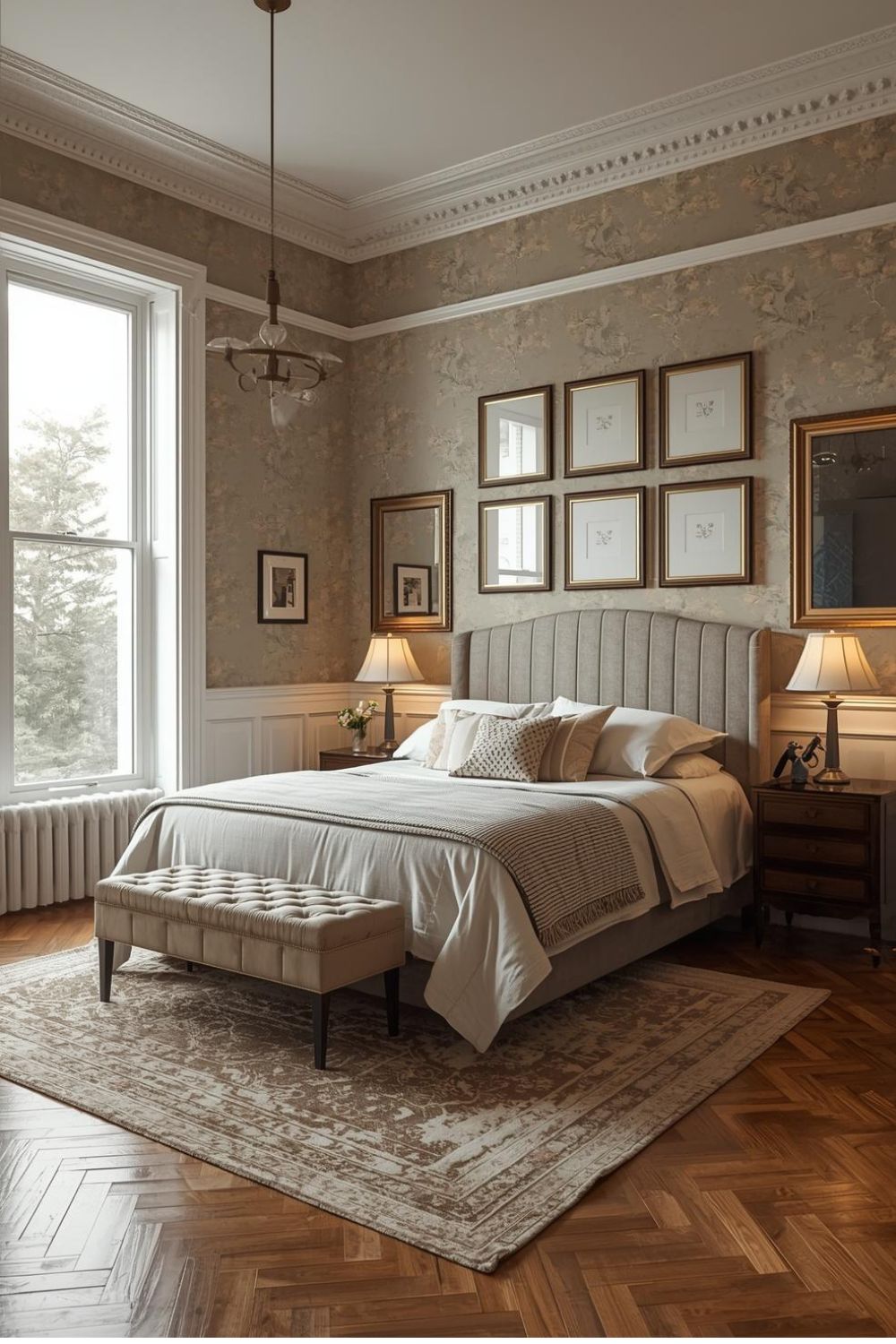A ceiling medallion and chandelier create a graceful Victorian focal point without taking up any space. Choose a smaller chandelier for a bedroom so the effect feels delicate, not overpowering. The mood becomes softly glamorous, especially at night when light sparkles gently. This suits anyone restoring period features or adding old-world charm to a modern room, and it pairs well with calm neutral palettes.