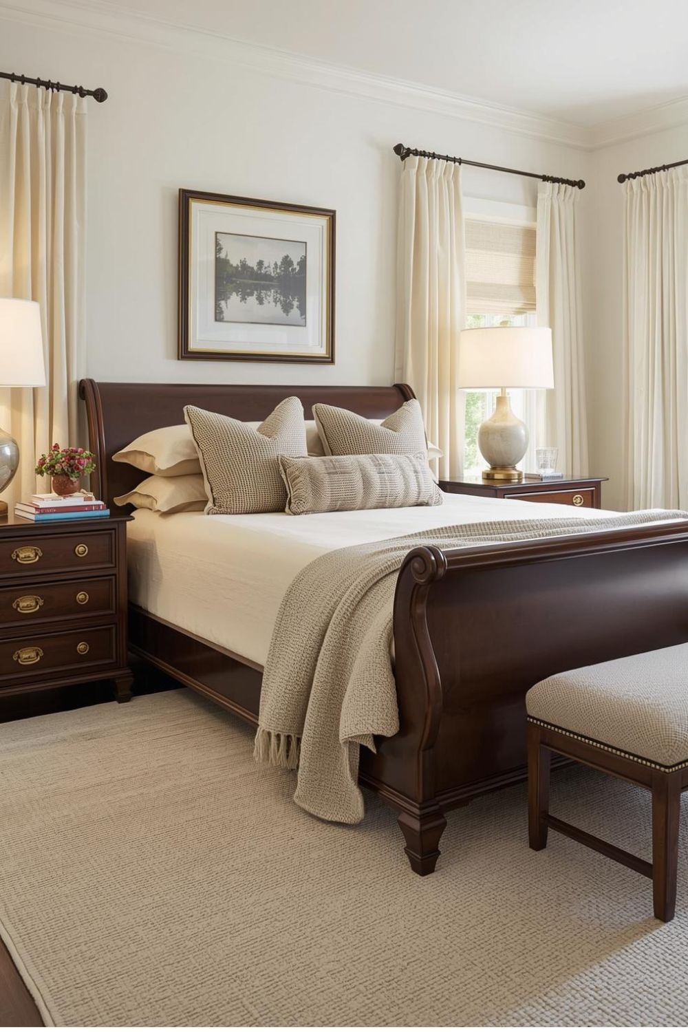 A sleigh bed brings traditional vintage presence, but you can keep it modern by brightening everything around it. Light walls, creamy bedding, and a large neutral rug soften the dark wood. Add warm lamps for a cozy evening mood. This style works for anyone who loves heritage shapes and wants a grounded, elegant bedroom.