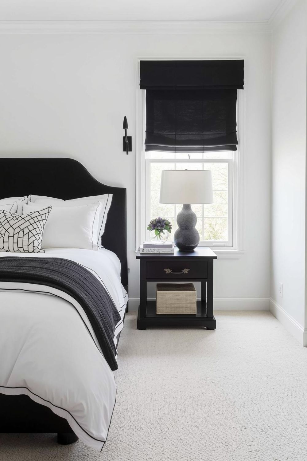 A piped edge is a small detail that reads “custom,” especially in a sharp black-and-white pairing. The clean shape works beautifully in a modern guest bedroom, and a muted lavender accent keeps the palette from feeling too stark. Dark sconce lighting makes the piping look extra crisp at night.